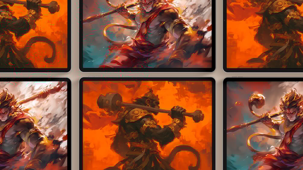 Experience the strength and unique personality of Lord Hanuman with these oil paintings-inspired wallpapers for your canvas. Select your preferred design and color scheme. Enhance the appearance of your screen with these striking wallpapers.